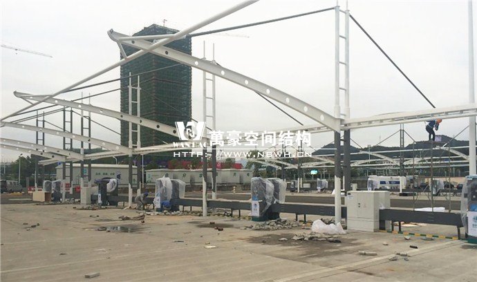 膜結(jié)構(gòu)雨棚施工面積約5138平方;用鋼量約80噸。施工難點在于工期緊。施工時天氣情況差,連續(xù)的陰雨天給鋼構(gòu)的油漆施工帶來了極大的麻煩并且延誤了工期。雨棚底下還要安裝充電樁,我們還要和充電樁施工班組進行技術(shù)對接,規(guī)劃充電樁的安裝位置。由于工期緊,天氣狀況差,我們動用了兩個施工班組加班加點,土建、鋼構(gòu)交叉施工,最后如期完工。由于每個雨棚長度比較長,施工班組在立好鋼構(gòu)件之后從中間開始往兩邊安裝膜布,使工作效率有了很大的提高。
