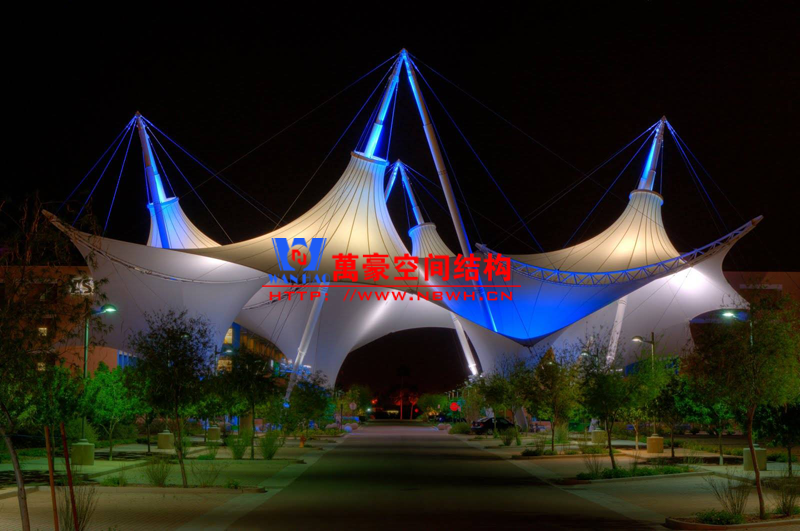 山東小品膜結(jié)構(gòu)工程的膜材是氟塑材料表面涂層與織物布基按照特定的工藝粘合在一起的薄膜材料。常用的氟塑材料涂層有PTFE(聚四氟乙烯)、PVDF(聚偏氟乙烯)等??椢锊蓟饕镁埘ラL(zhǎng)絲(滌綸PES)和玻璃纖維有兩種。膜材的粘合就是將涂層與基材合二為一組成通整體。膜結(jié)構(gòu)建筑結(jié)構(gòu)所用的膜材大多是以壓延成型和涂刮成型的。所謂壓延成型,就是將選定的軟PVDF經(jīng)塑煉后投入壓延機(jī),按照所需厚度、寬度壓延成膜,立即與布基粘合,再經(jīng)過(guò)軋花、冷卻即可制得壓延膜材。而涂刮成型,則是將聚氯乙烯糊均勻地涂或刮在布基上,再加熱處理即可獲得涂刮膜材,普遍的是采用刮刀直接涂刮,也有采用輥式涂刮的。