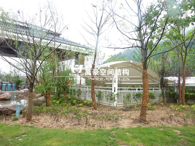 陽(yáng)明溫泉山莊車庫(kù)出入口膜結(jié)構(gòu) 福建酒店張拉膜結(jié)構(gòu)頂棚 餐廳膜結(jié)構(gòu)建筑案例