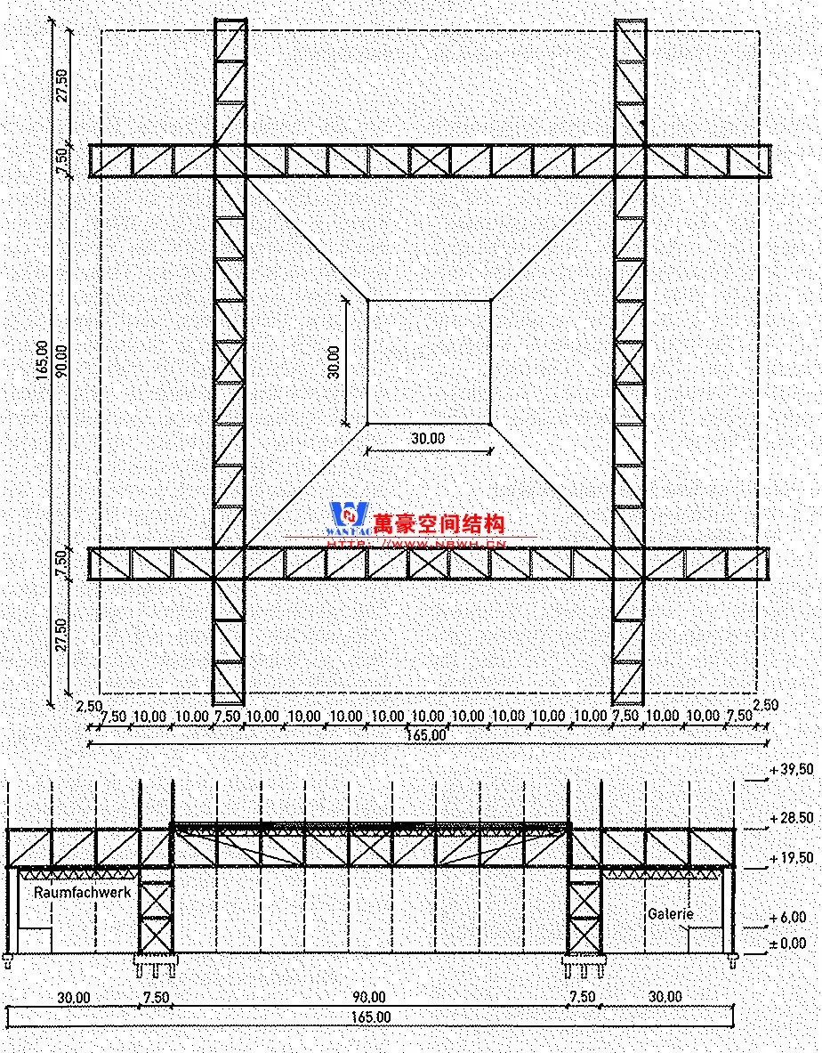 設計中采用了巨型結(jié)構(gòu)內(nèi)嵌子結(jié)構(gòu)的模數(shù)化方式。平面布置為十字形的矩形桁架支承在四個桁架核心筒上,結(jié)合中間設置的巨型下張弦體系將屋蓋體系分成了若干個最大跨度為30m的區(qū)域,而30m的跨度正好是當時流行的網(wǎng)架結(jié)構(gòu)的經(jīng)濟跨度。結(jié)構(gòu)工程師巧妙地結(jié)合了使用功能,與建筑師一起創(chuàng)造出了這個看似理所當然、實則內(nèi)有乾坤的體系。