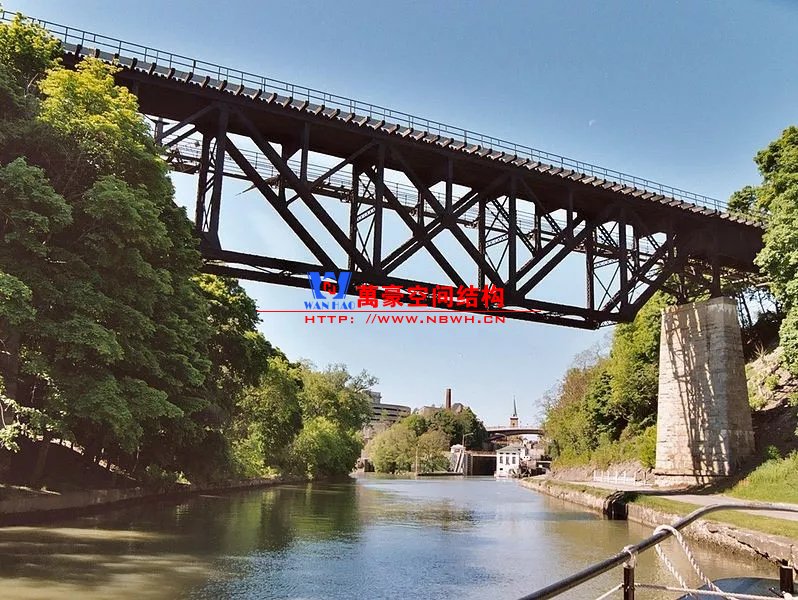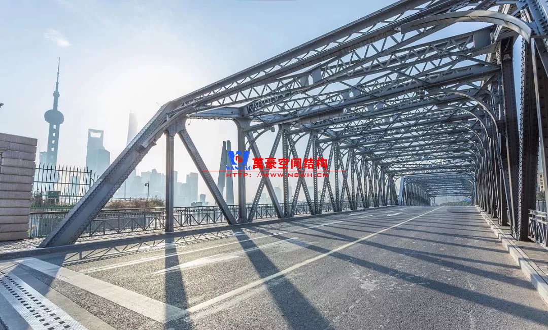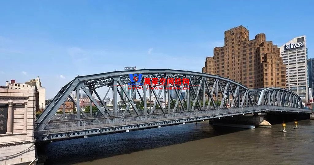 位于上海的外白渡橋是中國(guó)的第一座全鋼結(jié)構(gòu)鉚接橋梁,于1908年1月20日落成通車。該橋?yàn)橄鲁惺胶?jiǎn)支鋼桁架,兩孔跨經(jīng)組合各52.12米,橋面鋪設(shè)電車軌道。