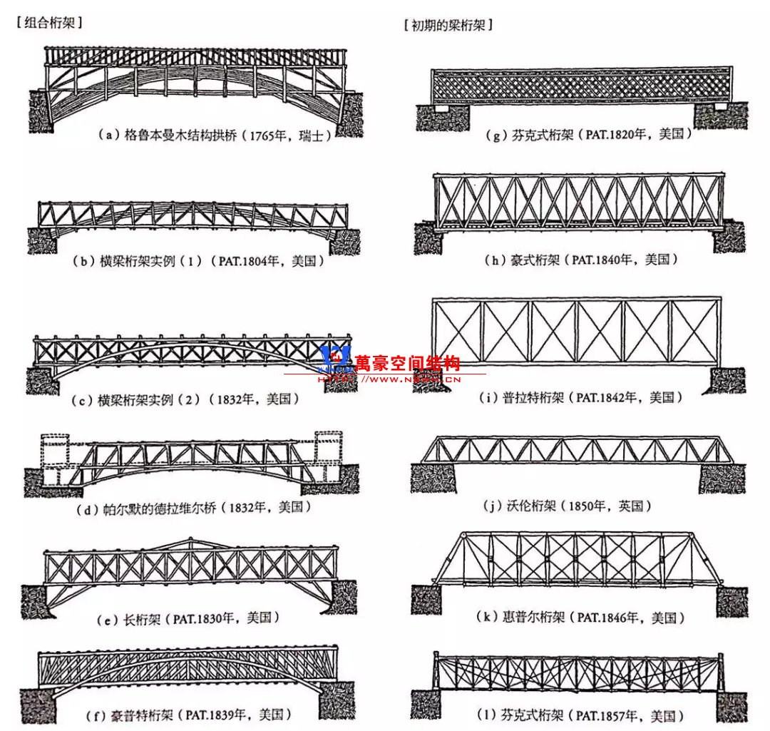 拱橋在均勻荷載下的承載力很大,但在火車的移動(dòng)不均勻荷載下則產(chǎn)生很大變形。因此木橋普遍采用拱橋和增強(qiáng)剛架結(jié)合的形式。經(jīng)過(guò)多次實(shí)踐發(fā)現(xiàn),只要把補(bǔ)強(qiáng)剛架做得足夠堅(jiān)固,甚至可以省去拱。于是各種新式的桁架紛紛出現(xiàn),梁桁架的時(shí)代從此開(kāi)始了。