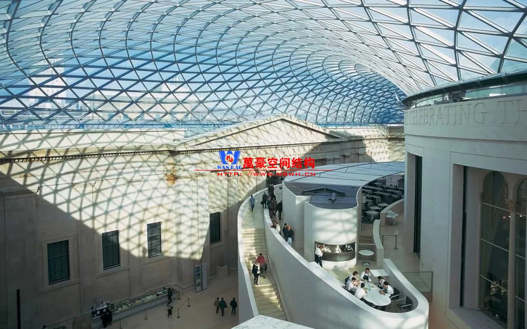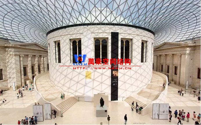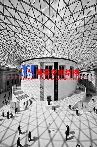 這個經(jīng)典的改造項(xiàng)目把輕與重巧妙組合。鋼結(jié)構(gòu)網(wǎng)殼內(nèi)側(cè)支承于圓形閱覽室,外側(cè)支承于方形博物館建筑的內(nèi)墻,通過找形分析得到一個拱起的規(guī)則形態(tài)。