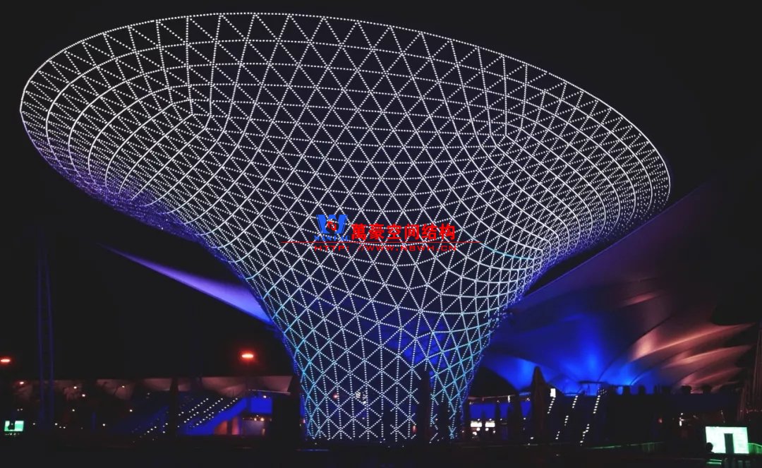 對于跨度比較小的天幕,采用單向梁或交叉梁即可實(shí)現(xiàn)。這一類天幕的結(jié)構(gòu)創(chuàng)新主要體現(xiàn)的網(wǎng)格布置、截面形式和節(jié)點(diǎn)細(xì)節(jié)方面。例如,網(wǎng)格布置可以是三角形、四邊形、聯(lián)方形、六邊形等等。