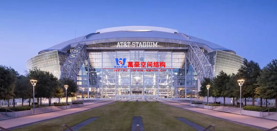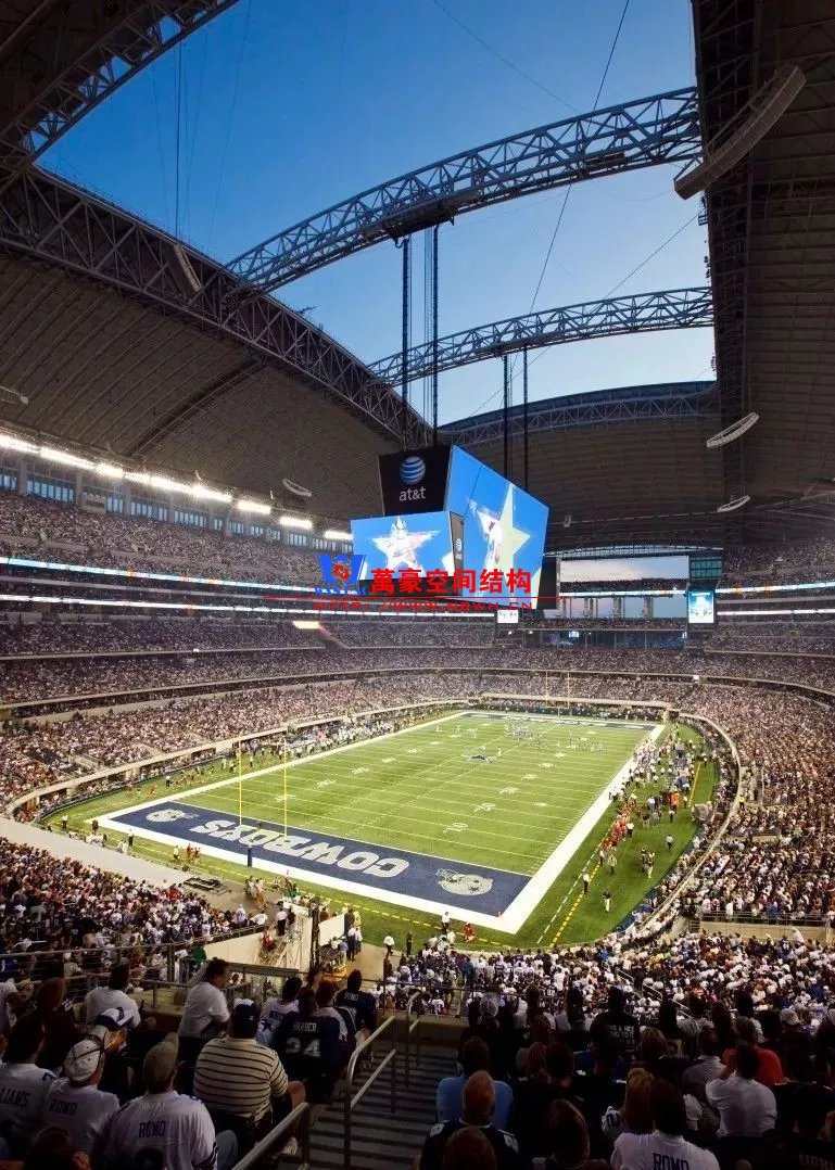 兩個(gè)鋼制拱形結(jié)構(gòu)分別覆蓋整個(gè)體育場(chǎng),長(zhǎng)達(dá)1,290英尺,支撐著體育場(chǎng)龐大的內(nèi)部空間,構(gòu)建了球場(chǎng)兩端入口的球迷廣場(chǎng)。