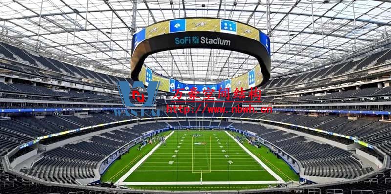 SoFi體育場可以說是蘊含了豐富的科技元素。先看他的造型, 俯瞰類似一個扇形,不由得讓人想起了公羊的羊角。SoFi體育場采用了可封閉式設(shè)計,這樣就可以控制極端天氣對比賽的干擾。球場整個頂部采用了透光性極佳的單層ETFE膜結(jié)構(gòu),以保證白天球場也能有很好的光線條件。