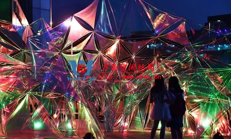 結(jié)構(gòu)體系形成的三角面網(wǎng)格是由計(jì)算機(jī)通過(guò)對(duì)異形曲面細(xì)分并優(yōu)化得到,三角嵌面使用半透明PVC膜。