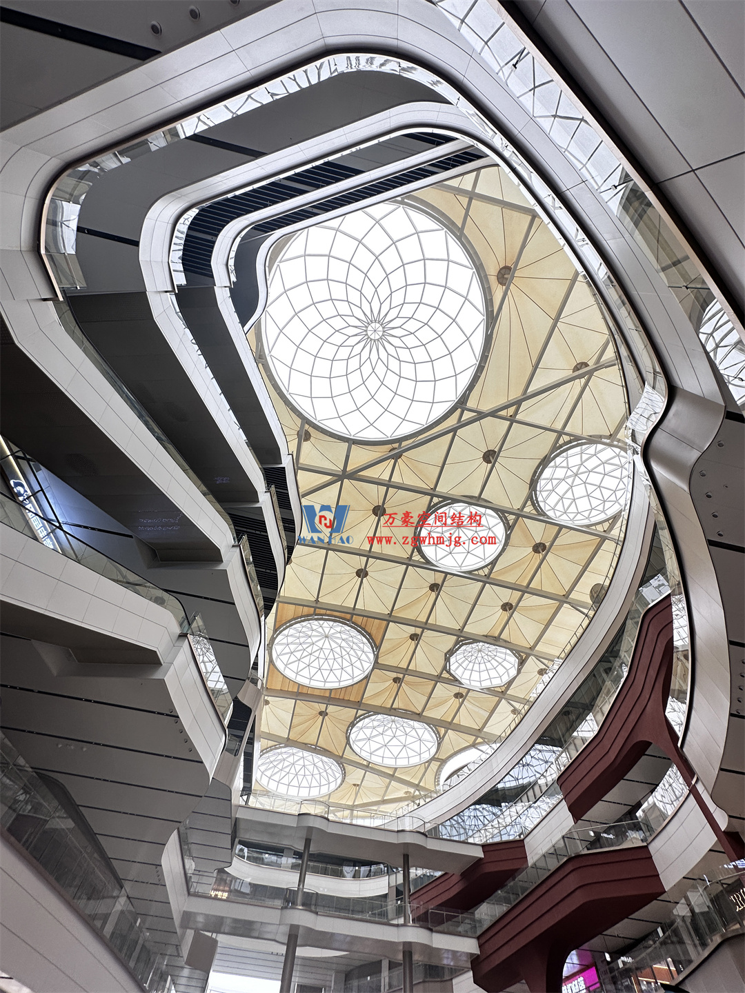 3、適應(yīng)大跨度:膜結(jié)構(gòu)材質(zhì)輕,適合大跨度的建筑設(shè)計(jì)。在大型商業(yè)街區(qū)中,常常需要建造開闊的空間,膜結(jié)構(gòu)穹頂能夠輕松滿足這一需求,無需過多的支撐結(jié)構(gòu),使空間更加開闊、通透。