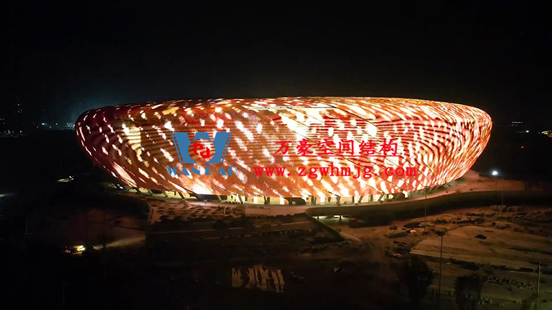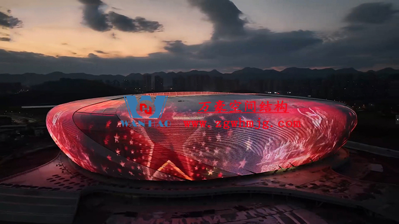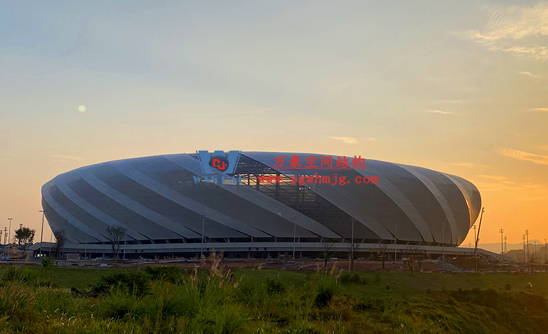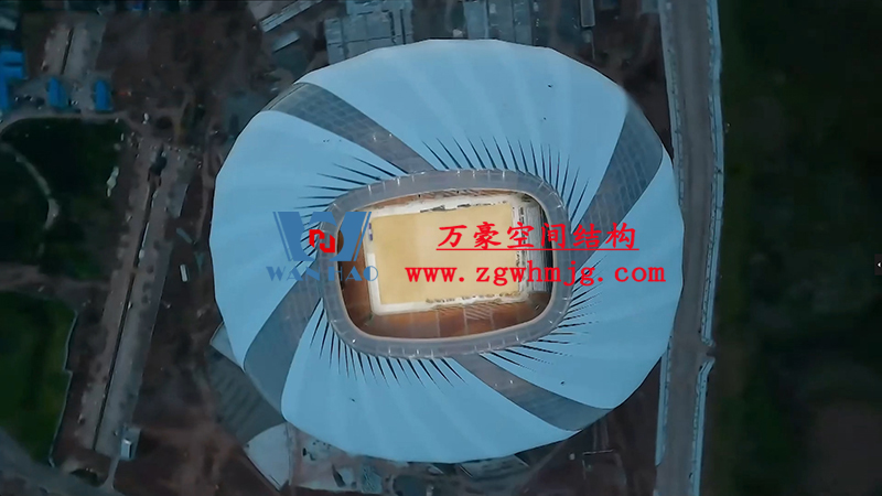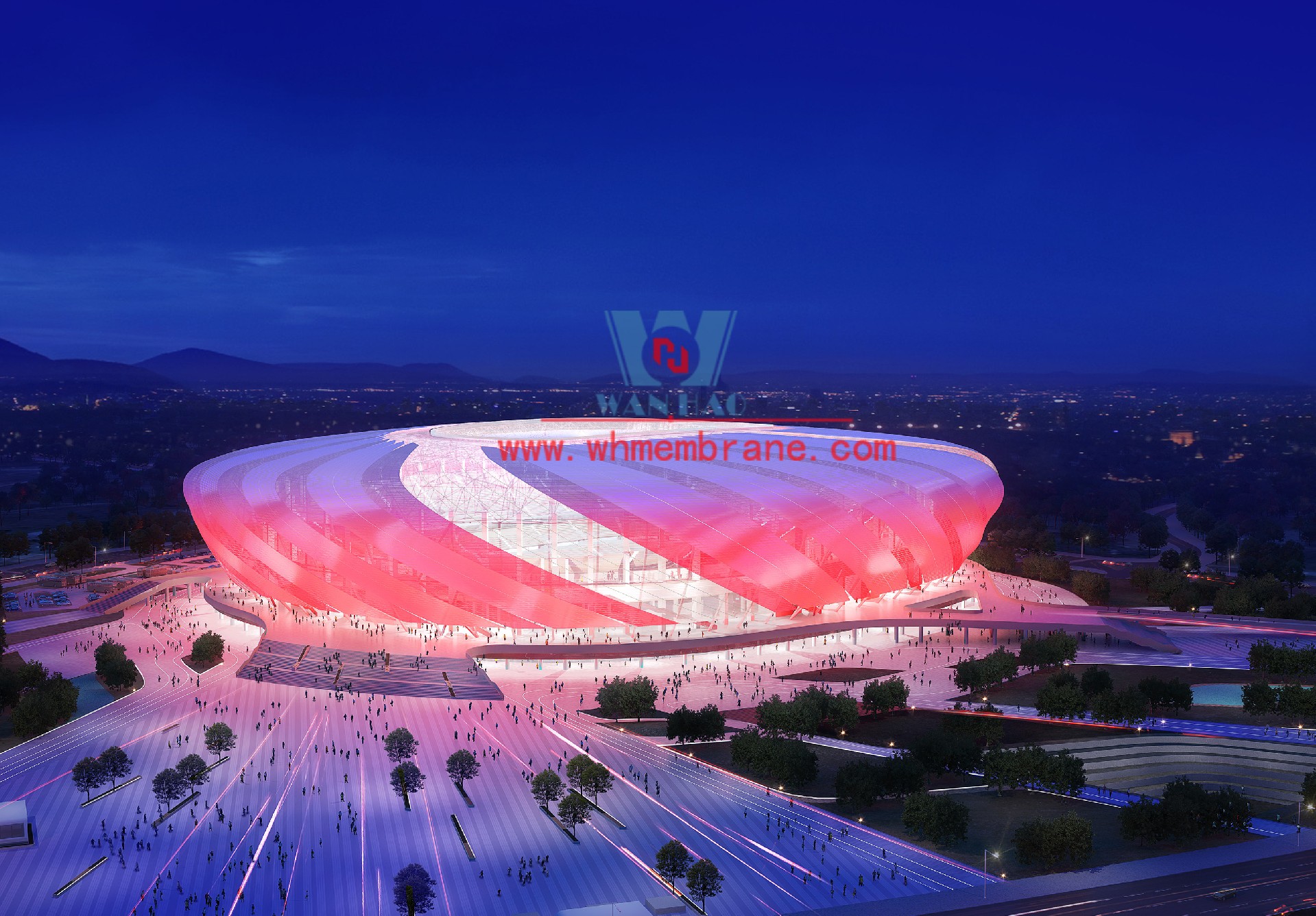 重慶龍興足球場項目位于重慶市兩江新區(qū),占地面積約303畝,總建筑面積約17萬平方米。足球場鋼屋蓋平面呈橢圓形,南北投影長283米、東西寬252米,屋面最大高度59.5米。該項目部分屋面材料選用進口高自潔ETFE膜材, 膜結構展開面積合計30000平米。