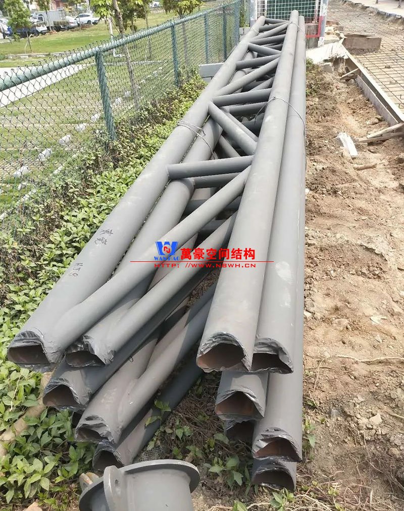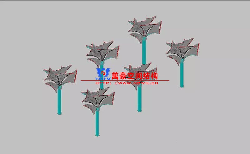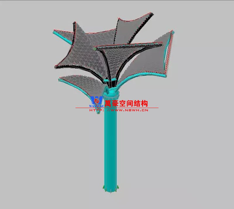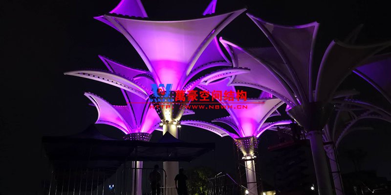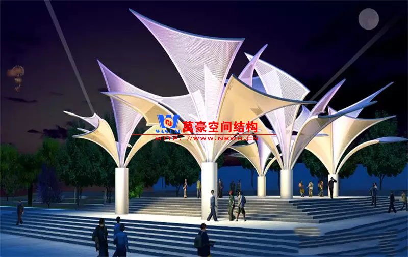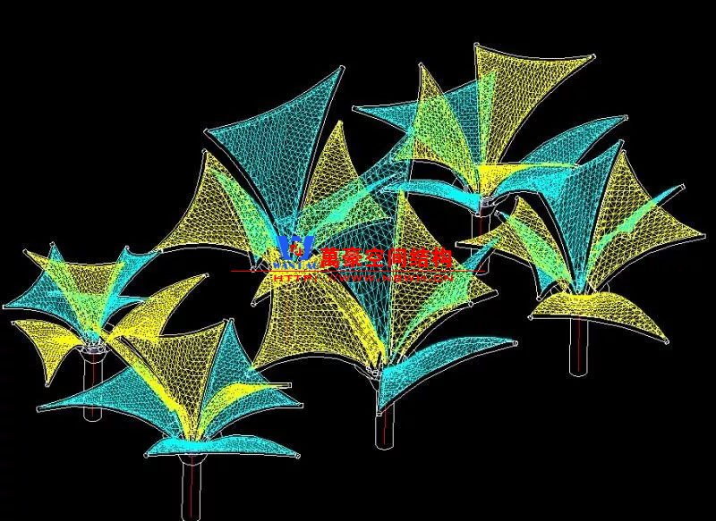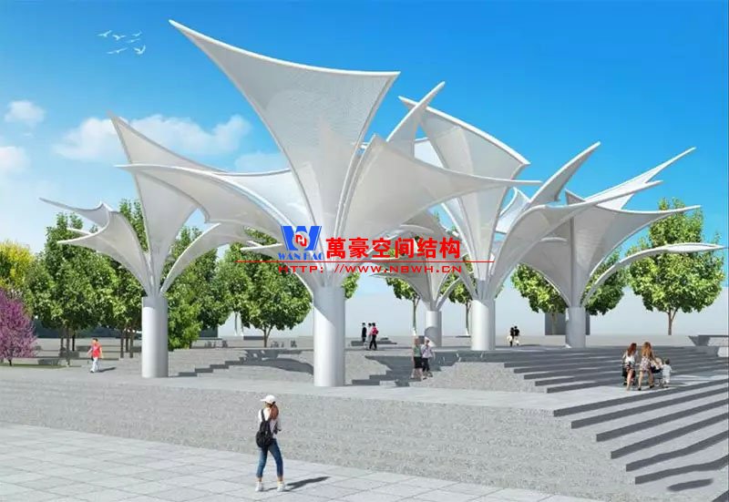 其中主席臺龍舟拉膜項目高度為7.25米,膜結(jié)構(gòu)屋面材質(zhì)為PTFE膜材。廣場鋼拉膜項目由六個龍船花造形景觀組成,每個龍船花景觀造形立柱的高度不得低于3.80米,花瓣造形最低高度 7.54米,花瓣造形最高高度9.608米,膜結(jié)構(gòu)屋面材質(zhì)為 PTFE網(wǎng)格基布雙面貼透明ETFE建筑膜。