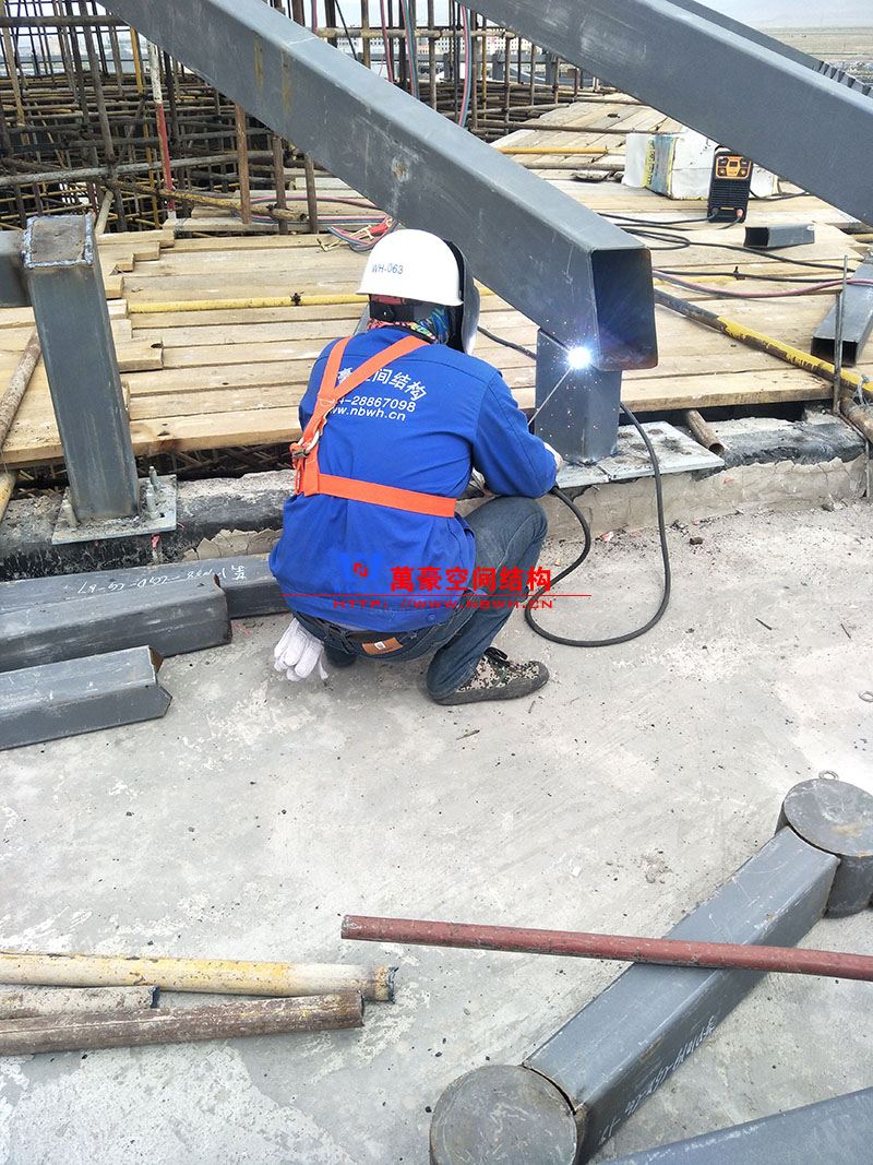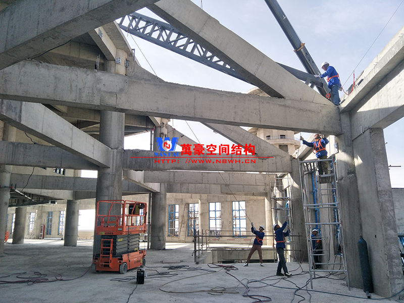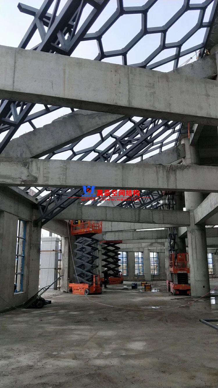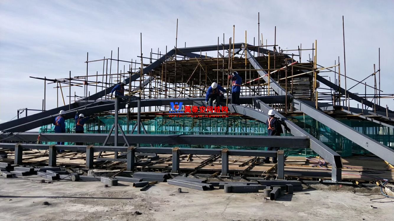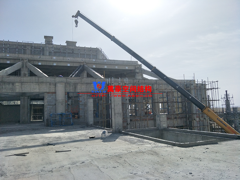 目前,主樓六邊形、二樓斜屋面每面四根大梁已全部安裝完畢,現(xiàn)在一個面的其他鋼構正在安裝中,穹頂大梁框架完成。