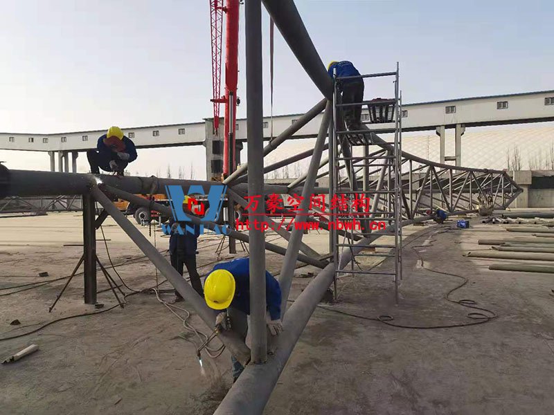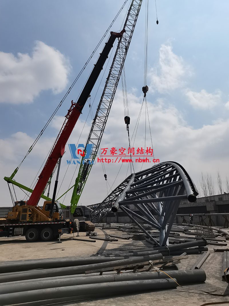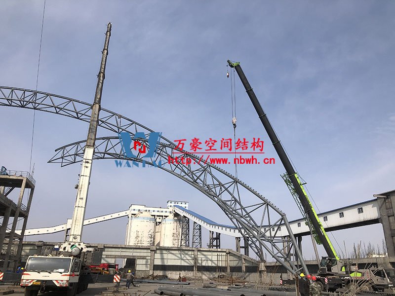 內蒙能源長城五礦選煤廠鋼骨架膜棚建設項目位于內蒙古鄂托克前旗上海廟鎮(zhèn)長城五礦選煤廠內。 本項目膜結構罩棚鋼結構高度40米,跨度115米,膜結構展開面積25000平米。 鋼結構主桁架一共6跨,目前已完成2跨。