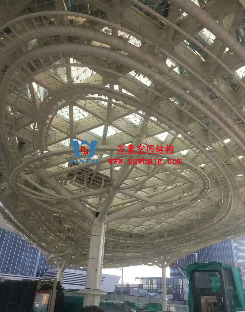 本工程鋼結(jié)構(gòu)為單層雙曲網(wǎng)殼結(jié)構(gòu)體系,平面上為對(duì)稱結(jié)構(gòu),大翅膀長(zhǎng)跨約 50m,短跨約 25m,小翅膀長(zhǎng)跨約 35m,短跨方向約 15m。建筑頂面為雙曲造型,建筑物最高點(diǎn)標(biāo)高約17米??傆娩摿?00噸,膜體總面積約7000平方米。