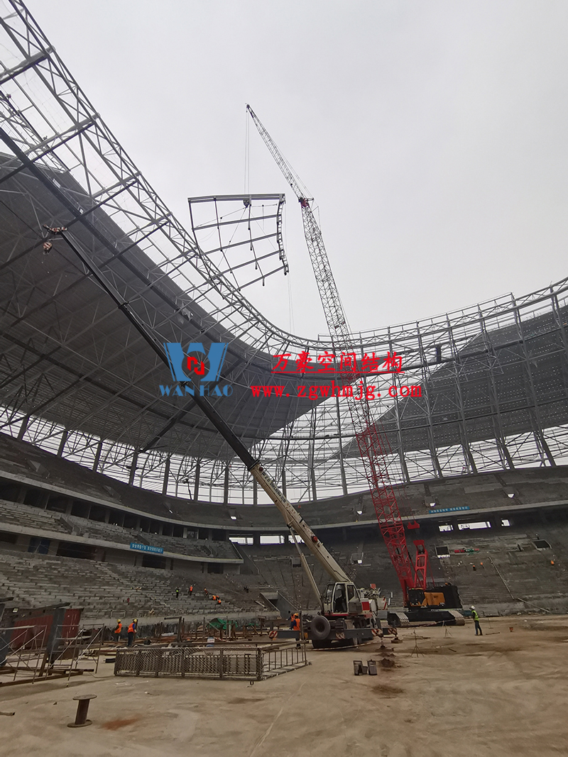 目前,項(xiàng)目屋面鋼結(jié)構(gòu)完成,屋面正在安裝膜結(jié)構(gòu),內(nèi)環(huán)鋼結(jié)構(gòu)施工30%,立面鋼結(jié)構(gòu)完成28%。