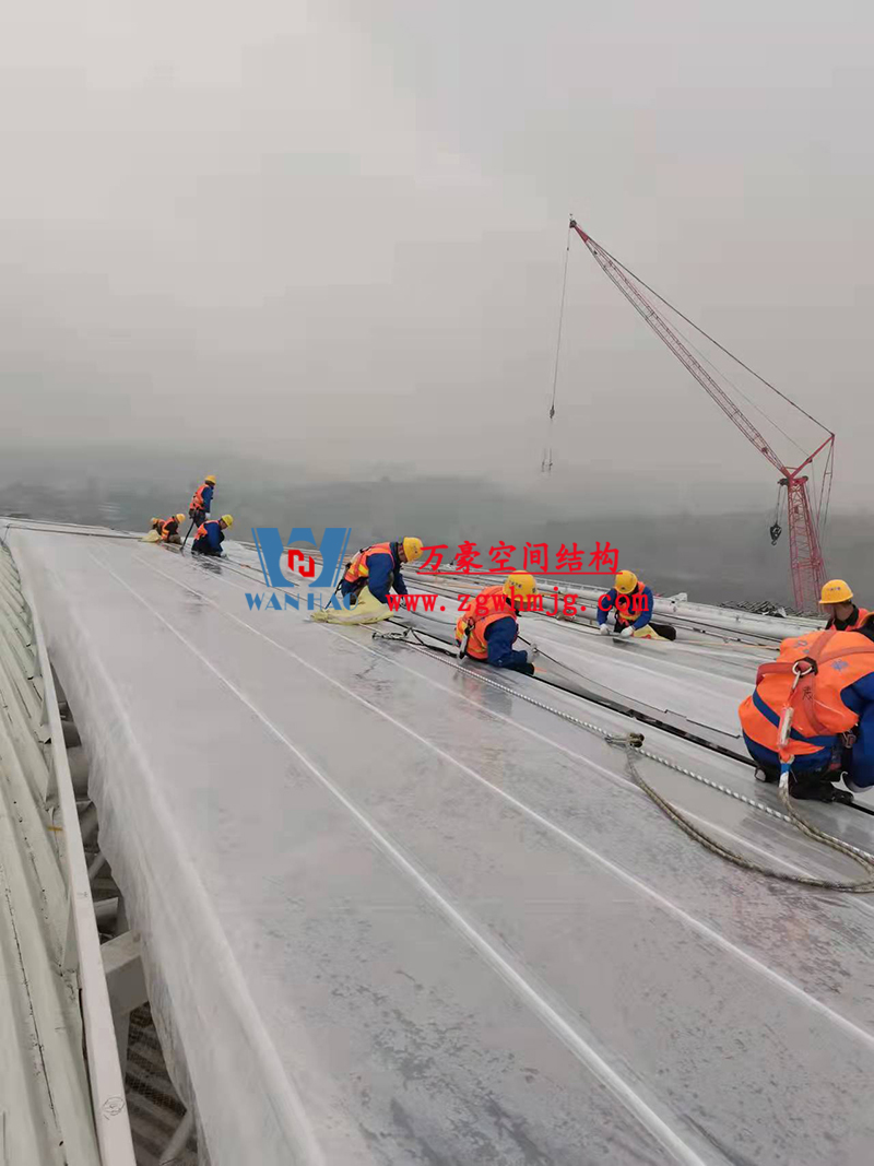 重慶龍興足球場(chǎng)項(xiàng)目位于重慶市兩江新區(qū),占地面積約303畝,總建筑面積約17萬平方米。足球場(chǎng)鋼屋蓋平面呈橢圓形,南北投影長(zhǎng)283米、東西寬252米,屋面最大高度59.5米。該項(xiàng)目部分屋面材料選用進(jìn)口高自潔ETFE膜材, 膜結(jié)構(gòu)展開面積合計(jì)30000平米。