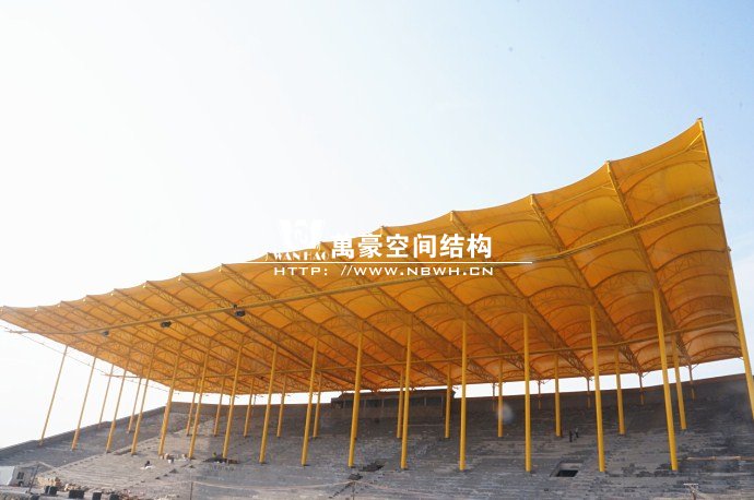 橫店影視城被一圈連綿起伏的山巒包圍著,層疊的遠(yuǎn)山宛如水墨畫。圓明新園則位于小鎮(zhèn)西邊的山巒中,芳草萋萋、溪水潺潺!花仙湖膜結(jié)構(gòu)看臺坐落于圓明新園春苑東北角,為骨架支撐式膜結(jié)構(gòu),建筑面積約為16000㎡,看臺主體結(jié)構(gòu)可分為15個單元,屋面膜結(jié)構(gòu)則由30片膜組成。主體結(jié)構(gòu)劃分為四大部分:鋼柱、主桁架、次桁架和馬道。鋼柱高34.76米,單個重量達(dá)8.2噸;主桁架長70.66米,柱間距15米,看臺屋面猶如浮動的金色流云,徜徉在花仙湖上空。此項目為全國最大的“水戲”表演建筑的看臺,同時也是水上樂園彩色膜結(jié)構(gòu)最大的一個景觀。