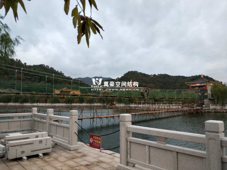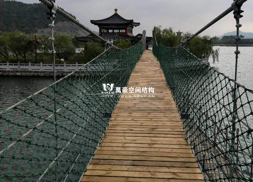 該橋采用8根柔性鋼絲繩,4支立柱作為受力構(gòu)件,橋面采用組合型鋼作為支撐面,上鋪防腐木枋板。根據(jù)橋面與水位的相對(duì)高程,吊橋主跨為65m。該橋橋面凈寬度為1.5m,吊橋橋面總寬度2.0m。上鋪4公分厚的防腐木枋板。最多可承受130人行走,橋下能自由通行龍船。符合景區(qū)游客娛樂(lè)性游玩與功能性通行的完美結(jié)合在一起。