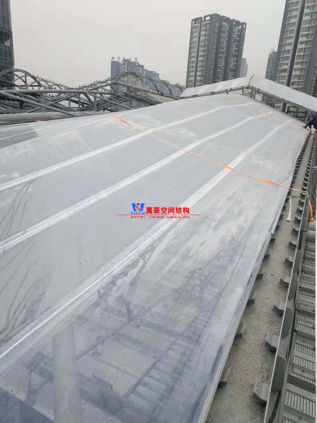 經(jīng)過不斷的日夜加班,遵義高鐵新城天幕膜結(jié)構(gòu)工程目前進入到膜材安裝階段。