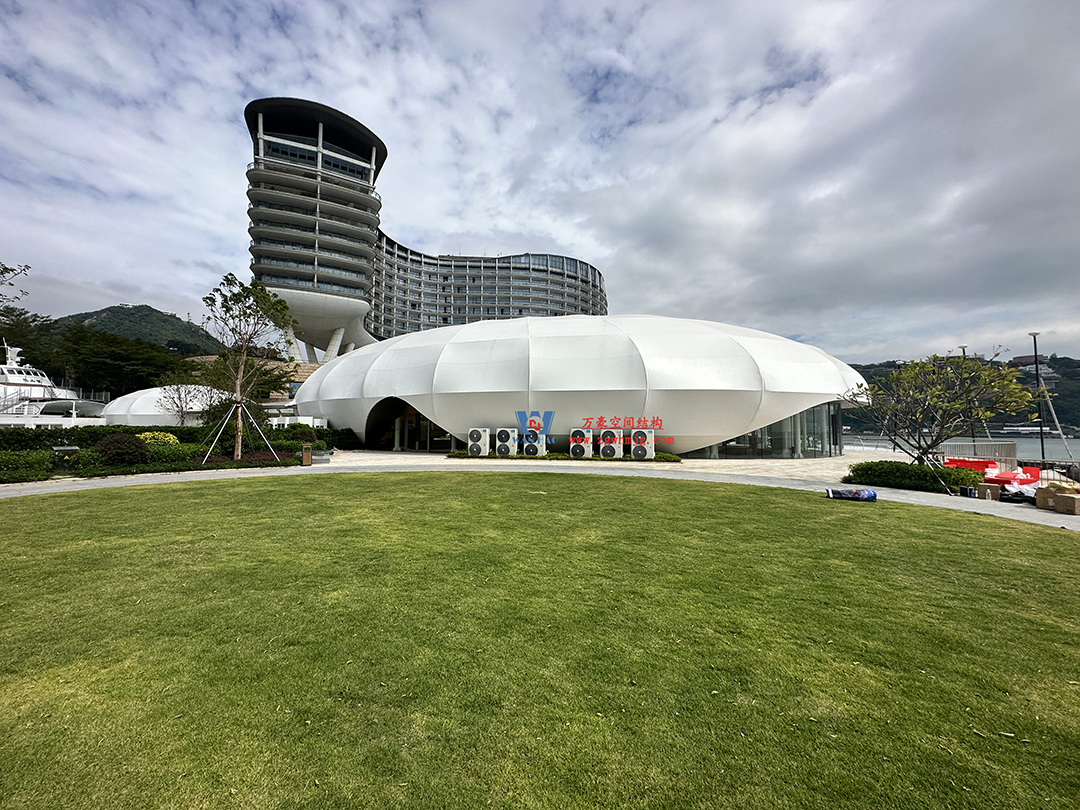 京基大梅沙酒店多功能活動(dòng)廳鋼膜結(jié)構(gòu)工程,該項(xiàng)目用鋼量約240噸,ETFE膜+PTFE膜展開(kāi)面積約2834平米。