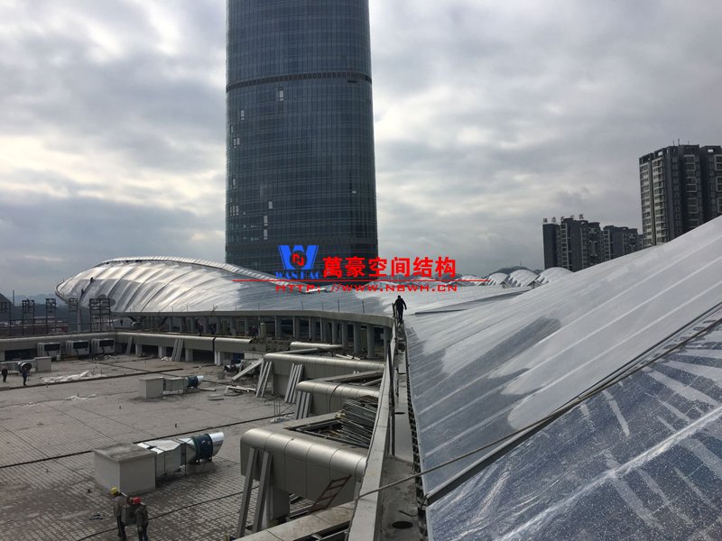 遵義高鐵新城天幕膜結(jié)構(gòu)工程用鋼量500噸,膜展開面積8000平米。