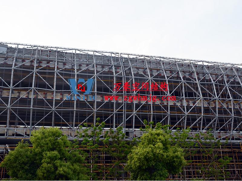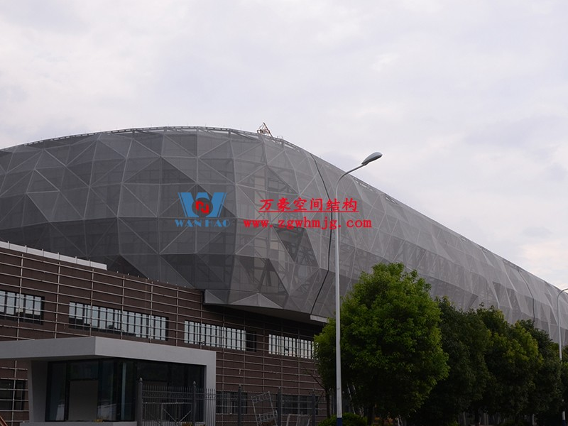 寧波菲仕展廳外立面網(wǎng)格膜結構項目,方案由意大利著名建筑師設計,設計靈感取鉆石之意。為了實現(xiàn)多變的設計效果,整個外立面采用了8000根形狀各異的鋼構件,每根桿件單獨編號、定位,實施難度極大。外層使用PTFE網(wǎng)格膜,樹立了PTFE網(wǎng)格膜使用的新標桿。用鋼量880噸,PTFE膜展開面積12660平方。