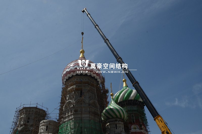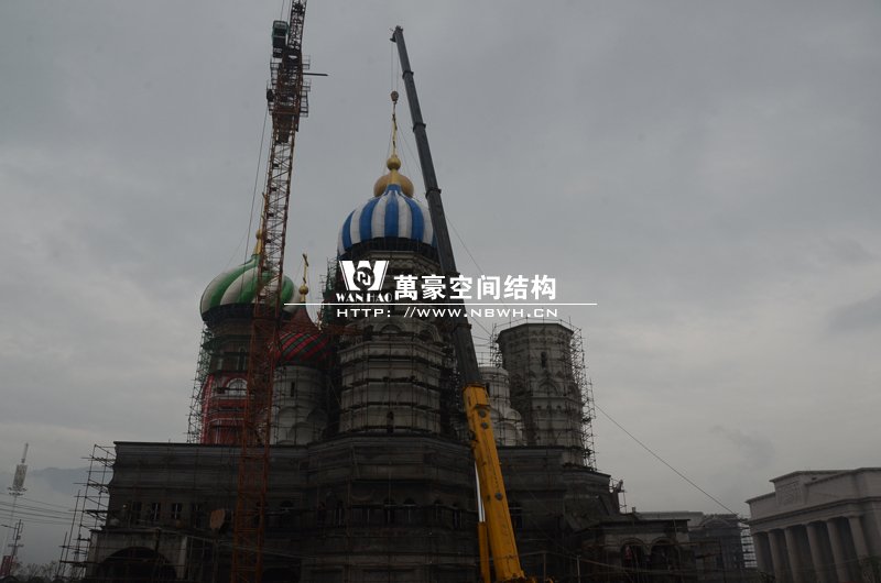 橫店影視城俄羅斯館屋頂鋼結(jié)構(gòu)裝飾球吊裝完成,本次吊裝的九個(gè)裝飾采用鋼結(jié)構(gòu)骨架、鋁合金外殼,最重的裝飾球達(dá)20來噸,采用300多噸的大吊車進(jìn)行吊裝。