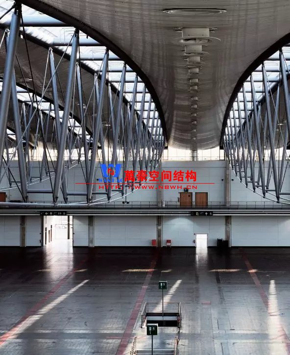 漢諾威會展中心是世界上最大、最負盛名的會展中心,超過50萬m2的凈展面積和每年超過50場的頂級展會,使其幾十年來穩(wěn)居行業(yè)龍頭地位。1994年,在漢諾威會展中心4號展廳的競賽中,德國gmp國際建筑設計有限公司(以下簡稱gmp)和sbp結(jié)構(gòu)工程師事務所(以下簡稱sbp)聯(lián)袂中標。展廳提供了一個通過玻璃采光頂自然采光的185.6m×116m的無柱大空間,凈展面積超過21 500㎡。雙層屋面結(jié)構(gòu)的下層以承重金屬波形板將屋頂下的設備管道保護起來,同時利用雙層金屬板結(jié)構(gòu)之間的空腔進行正壓送風,使得灰塵難以進入到空腔和管道。4號廳可以舉辦多種不同類型的活動,特別是容易產(chǎn)生灰塵的馬術等。