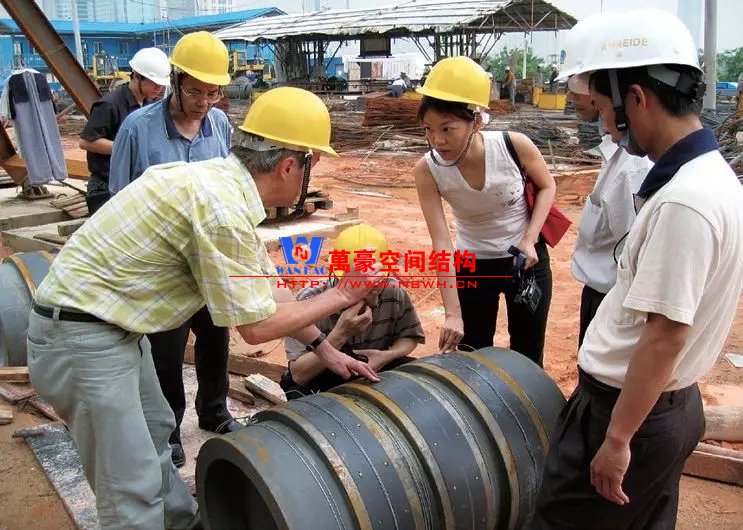 精心設計和建造的柱腳節(jié)點成為了整個項目的亮點。為了保證其轉(zhuǎn)動能力和側(cè)力傳力可靠,按設計要求,柱腳鉸支座的安裝精確到間隙不能超過15mm,這意味著跨度126m、高26m、重約500t的鋼箱梁連接在鉸支座上,兩邊間隙只能放進兩根頭發(fā)絲。這些經(jīng)驗為后續(xù)其他項目的鋼結(jié)構(gòu)加工和驗收提供了非常重要的技術支持。