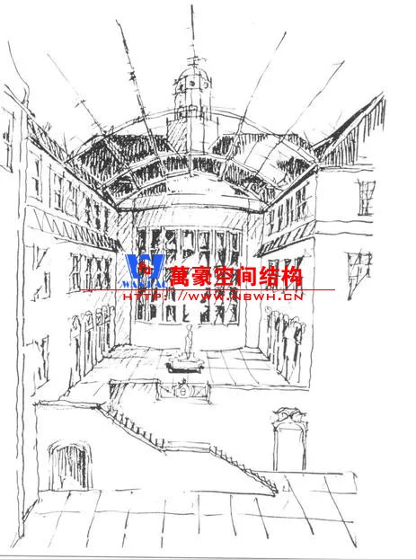 漢堡博物館中庭要加建一個(gè)頂棚。中庭平面呈L形,一端寬度14m、一端寬度17m。