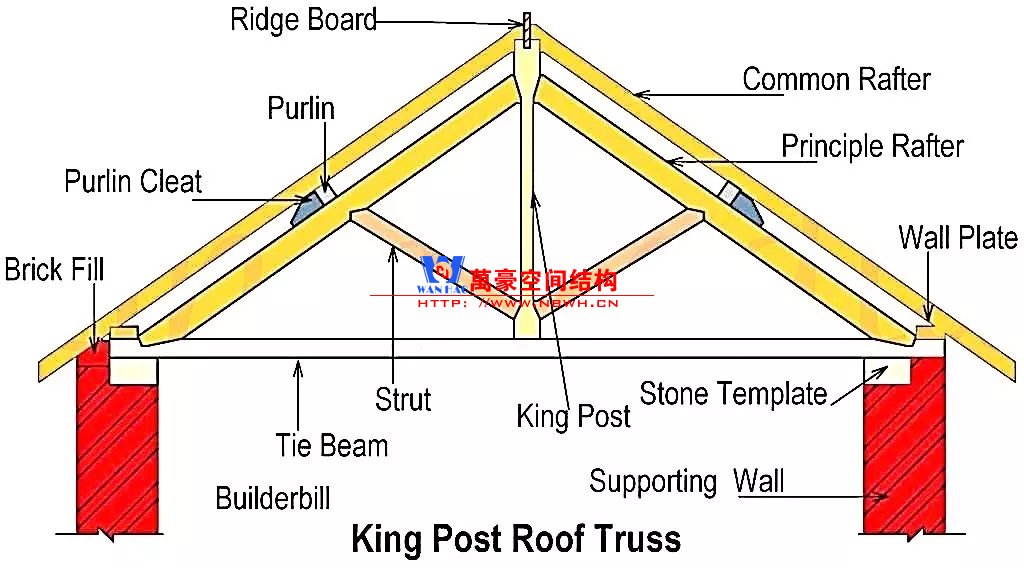 早期的三角桁架只有2根斜置上弦桿和1根水平下弦桿。而后,人們根據(jù)經(jīng)驗(yàn),嘗試在三角形內(nèi)部對(duì)應(yīng)弦桿中間點(diǎn)的位置,增加了3根腹桿,演化出單柱式屋架(KingPost Truss)和雙柱式屋架(QueenPost Truss) 兩種基本形式。