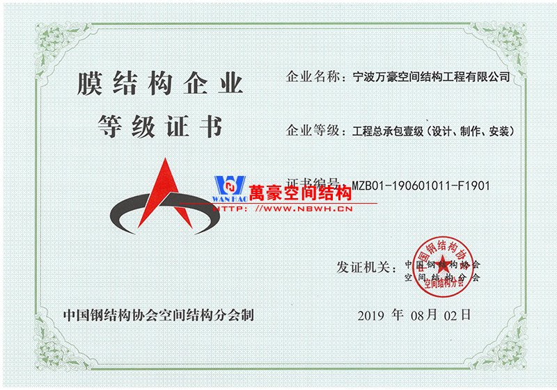 膜結(jié)構(gòu)行業(yè)目前擁有的最高資質(zhì)是膜結(jié)構(gòu)設(shè)計(jì)一級(jí)資質(zhì)和膜結(jié)構(gòu)承包一級(jí)資質(zhì)。同時(shí)擁有這兩個(gè)資質(zhì)的膜結(jié)構(gòu)公司,其實(shí)力是得到行業(yè)協(xié)會(huì)認(rèn)可的,做出來的工程質(zhì)量自然有保證。萬豪不但擁有這兩個(gè)一級(jí)資質(zhì),還擁有鋼結(jié)構(gòu)三級(jí)資質(zhì),這意味著什么呢?這意味著與膜結(jié)構(gòu)相關(guān)的鋼結(jié)構(gòu),萬豪有能力一并處理,配套加工出來的膜結(jié)構(gòu)與鋼結(jié)構(gòu),自然更有質(zhì)量保證。