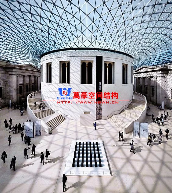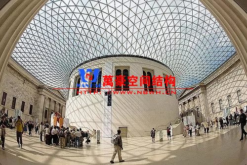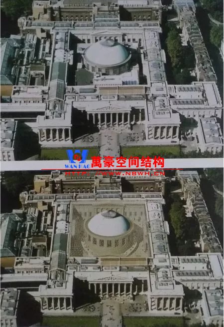 這個經(jīng)典的改造項(xiàng)目把輕與重巧妙組合。鋼結(jié)構(gòu)網(wǎng)殼內(nèi)側(cè)支承于圓形閱覽室,外側(cè)支承于方形博物館建筑的內(nèi)墻,通過找形分析得到一個拱起的規(guī)則形態(tài)。