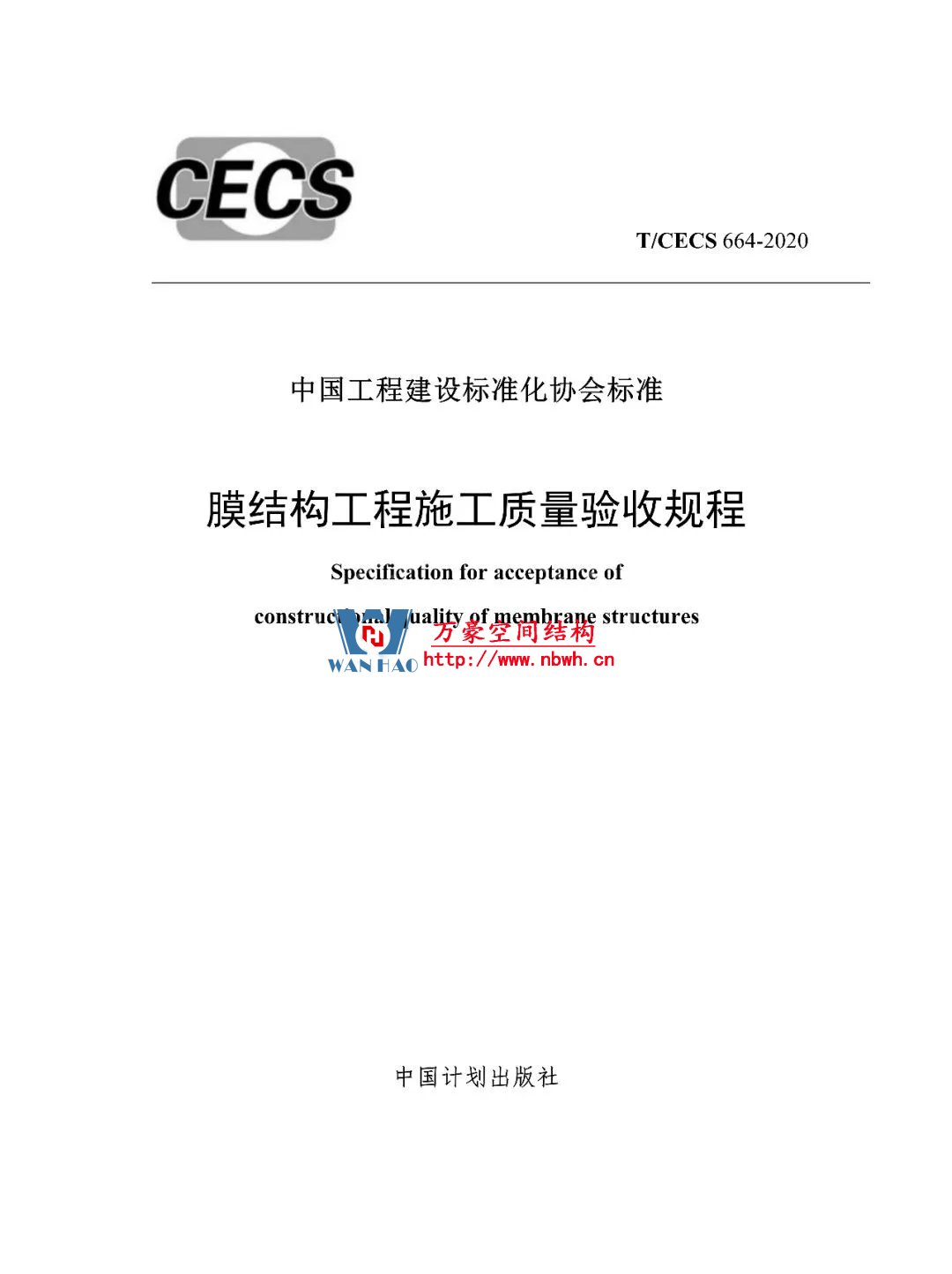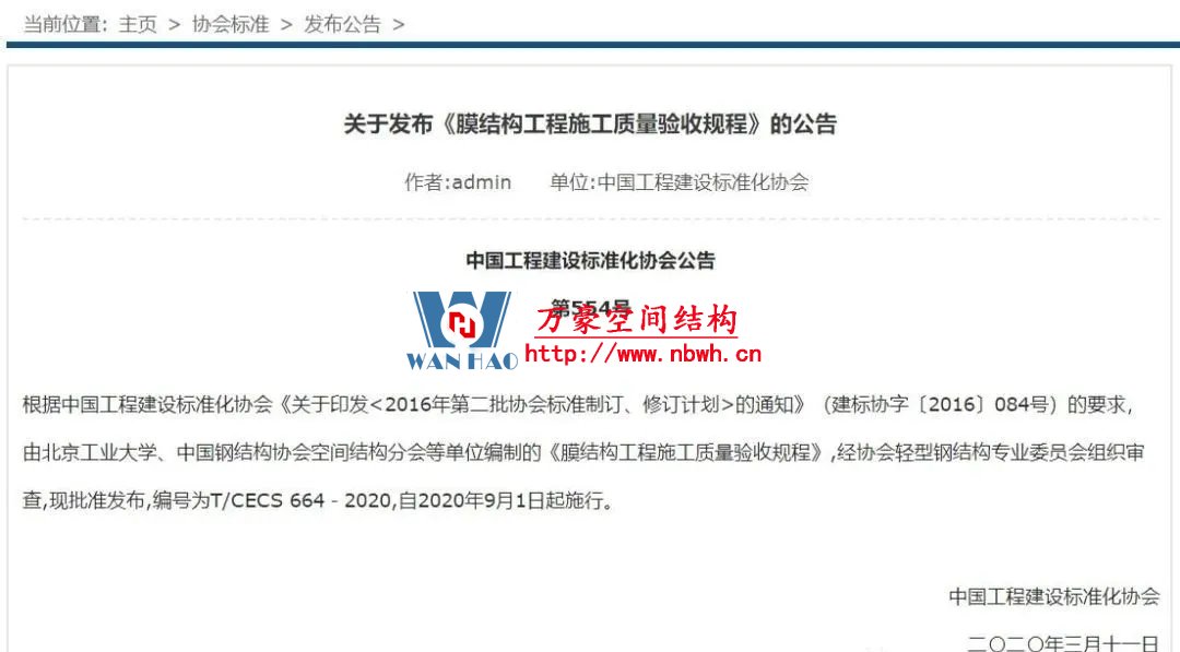 根據(jù)中國(guó)工程建設(shè)標(biāo)準(zhǔn)化協(xié)會(huì)《關(guān)于印發(fā)<2016年第二批協(xié)會(huì)標(biāo)準(zhǔn)制訂、修訂計(jì)劃>的通知》(建標(biāo)協(xié)字〔2016〕084號(hào))的要求,由北京工業(yè)大學(xué)、中國(guó)鋼結(jié)構(gòu)協(xié)會(huì)空間結(jié)構(gòu)分會(huì)等單位編制的《膜結(jié)構(gòu)工程施工質(zhì)量驗(yàn)收規(guī)程》,經(jīng)協(xié)會(huì)輕型鋼結(jié)構(gòu)專(zhuān)業(yè)委員會(huì)組織審查,現(xiàn)批準(zhǔn)發(fā)布,編號(hào)為T(mén)/CECS 664-2020,自2020年9月1日起施行。