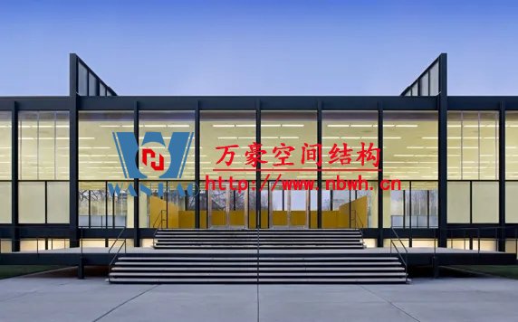 1942年,密斯制作了一個音樂廳的照片拼貼畫,采用阿爾伯特·康于1937年設(shè)計的格倫·馬丁飛機(jī)組裝大樓的室內(nèi)做為背景,在其中設(shè)置了木材和鋼板制成的靈活的墻和頂棚,疊加上他的基本空間概念。阿爾伯特·康是為亨利·福特和其他底特律汽車工業(yè)家服務(wù)的建筑師,設(shè)計了適應(yīng)于汽車生產(chǎn)線的大空間廠房。30年代末,美國的鋼鐵技術(shù)已經(jīng)能夠生產(chǎn)更大的斷面,焊接方法開始在建筑中替代鉚接,使節(jié)點更為簡潔。這些新技術(shù)促成了更大跨度的屋蓋,增加了建筑空間的可能性。1952-1953年,密斯又發(fā)展了康拉德·瓦克斯曼為美國空軍機(jī)庫所設(shè)計的結(jié)構(gòu),為芝加哥會議中心設(shè)計了一個會議大廳,約720英尺見方,屋面采用網(wǎng)架結(jié)構(gòu),結(jié)構(gòu)高度約30英尺,側(cè)面端頭懸挑達(dá)60英尺。拼貼畫的室內(nèi)使用大理石紋理代表大空間內(nèi)的墻體飾面。密斯引用康和瓦克斯曼的結(jié)構(gòu)做為自己作品的支撐,啟示了一個鋼結(jié)構(gòu)通用大空間的新時代。
