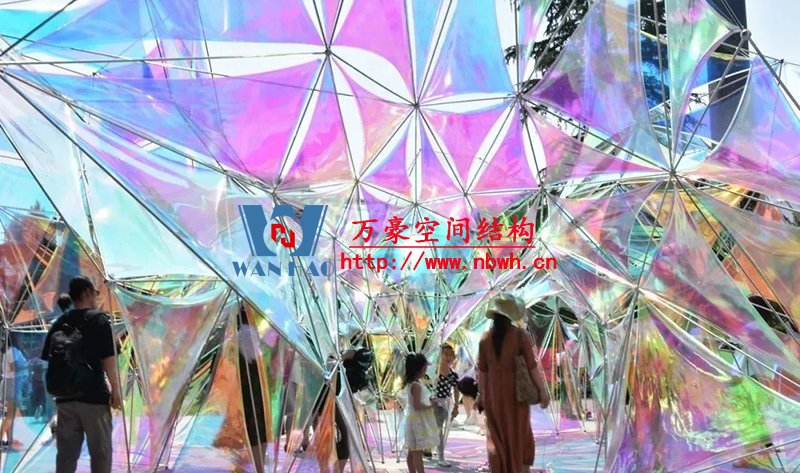 結(jié)構(gòu)體系形成的三角面網(wǎng)格是由計(jì)算機(jī)通過(guò)對(duì)異形曲面細(xì)分并優(yōu)化得到,三角嵌面使用半透明PVC膜。