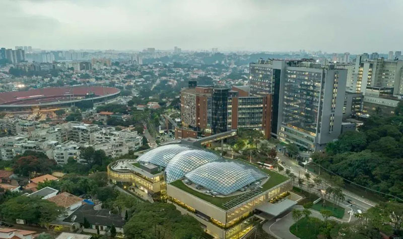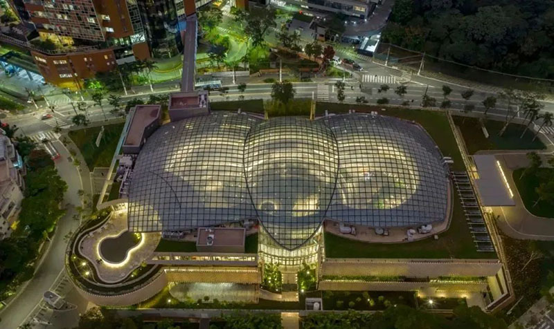 作為拉丁美洲最先進的醫(yī)學研究機構(gòu)之一,阿爾伯特·愛因斯坦醫(yī)學教育研究中心(Albert Einstein Education and Research Center, AEERC)坐落在巴西圣保羅莫倫比住宅區(qū),是巴西第一所由私立醫(yī)院建立的醫(yī)學院,被認為該領(lǐng)域最重要的學習及研究機構(gòu)之一。3,800平方米的玻璃屋頂,由三個巨大的穹頂互相交疊而成,組成了一個網(wǎng)格化的殼體,以最輕的鋼結(jié)構(gòu)撐起了86米的巨殼。同時,多層玻璃的組合設(shè)計,兼具濾光、散熱和吸聲功能。天窗外層由1854塊高透明度玻璃板構(gòu)成,使用的玻璃材料反射率極小,可以避免反光影響。此外,玻璃板涂有三層銀面,能夠減少太陽輻射熱能,印在其上的半透明陶點還可用于遮陽。天窗內(nèi)層為透明的ETFE膜結(jié)構(gòu),其上設(shè)有微型孔洞用于吸收噪音,并印有定制的半透明圓點以輔助遮陽。天窗的穹頂中央幾近透明,而靠近東西兩端圓點密度逐漸增大,使得充足的自然光可以照向中央花園茂盛的植物,而東西方向的低角度陽光則被有效遮蔽。同時,這些圓點在自然光下形成獨特的光線效果——從下方看,層層疊疊的點狀圖案仿佛斑駁的樹影,營造出在巨樹下沐浴陽光的獨特感受。薩夫迪建筑事務(wù)所聯(lián)合了國際景觀、環(huán)境和園藝團隊,在植物選擇、土壤混合、容器設(shè)計、灌溉、維護和環(huán)境控制系統(tǒng)等多個方面進行了為期兩年的深入研究,并借鑒了新加坡的濱海灣花園(Gardens by the Bay)、星耀樟宜機場(Jewel Changi Airport),以及英國的邱園(Kew Gardens)、伊甸園(Eden project)等項目的成功經(jīng)驗。
