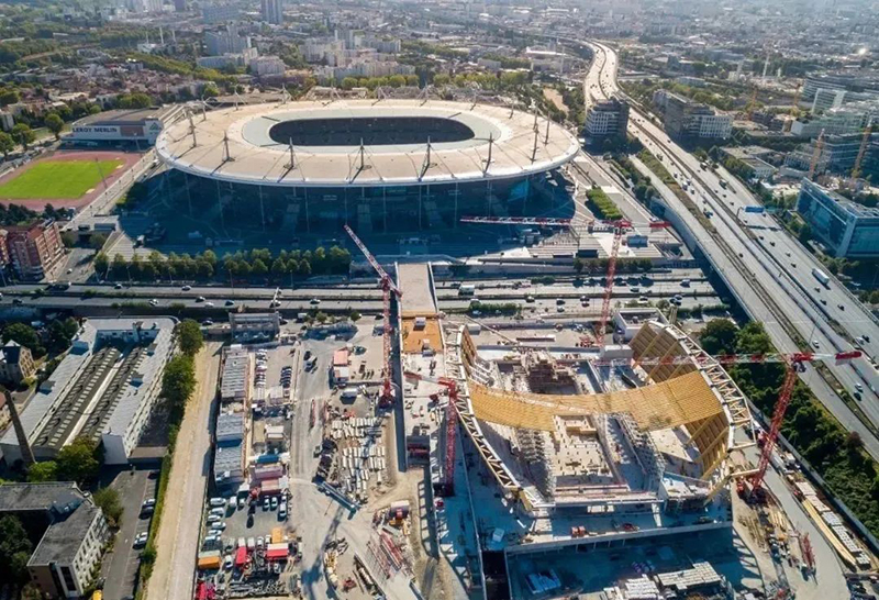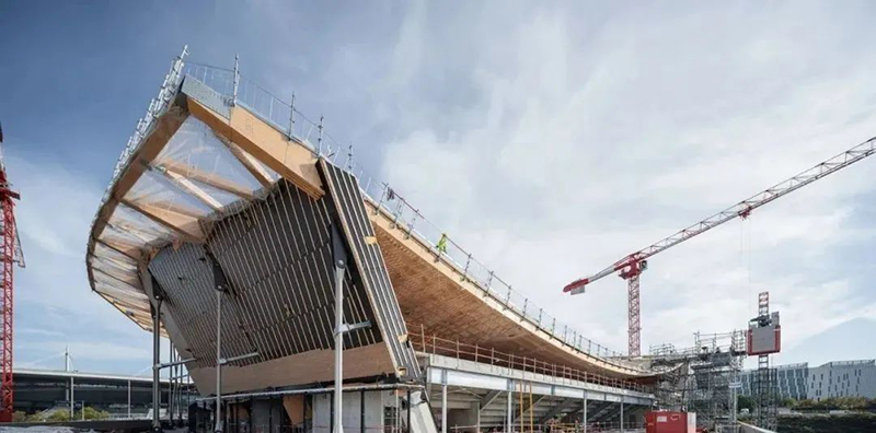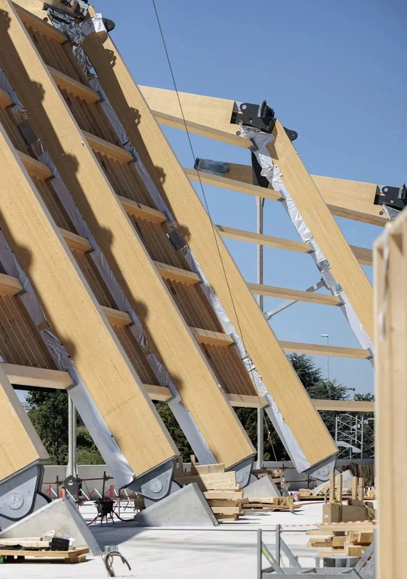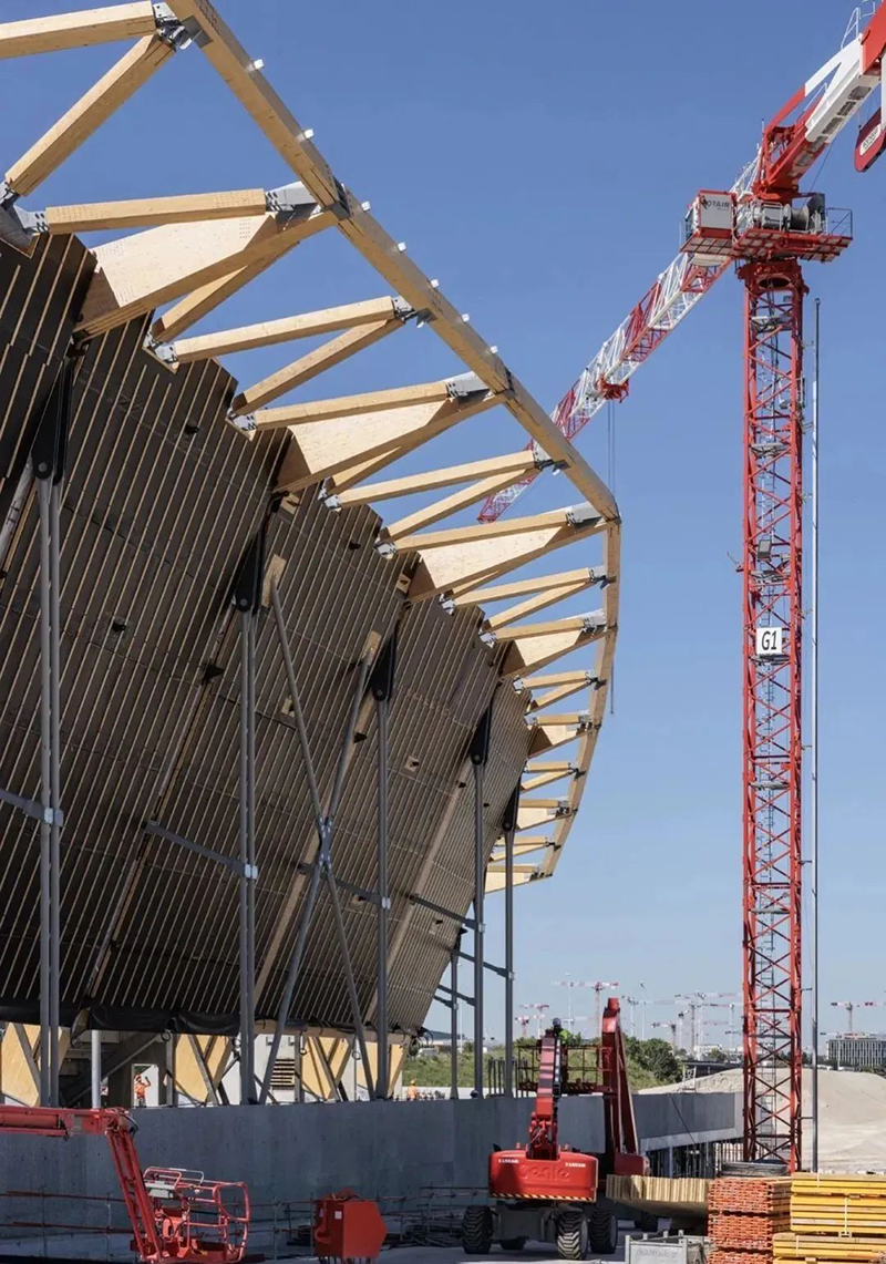 木材是典型的生物基建筑材料之一,是該建筑的主要結(jié)構(gòu)材料。因?yàn)槟静谋绕渌牧希ㄈ缁炷梁弯摬模┧a(chǎn)生的二氧化碳排放量更少,正好迎合巴黎舉辦歷史上最可持續(xù)的運(yùn)動(dòng)會(huì)的目標(biāo)。通過(guò)在這個(gè)巨大的結(jié)構(gòu)中使用木材,該方案將生物材料的使用比例提高了一倍。