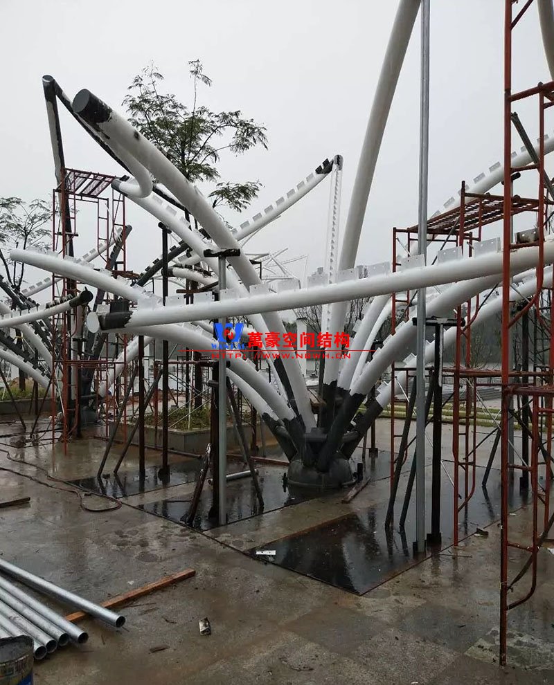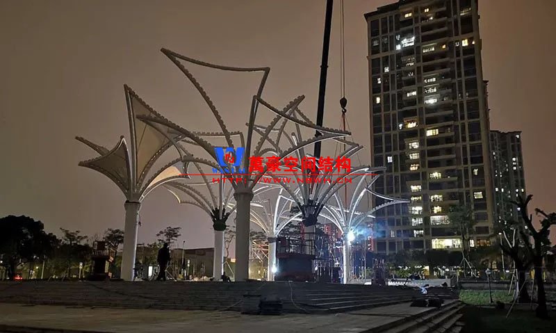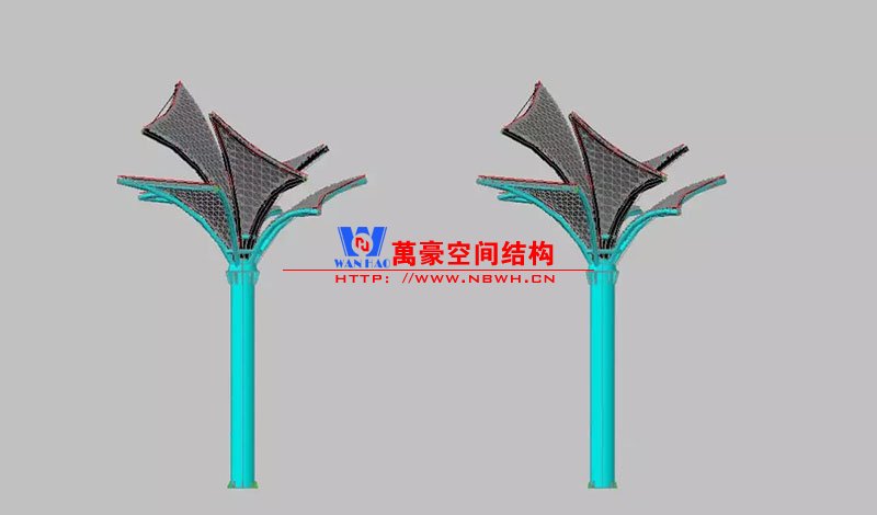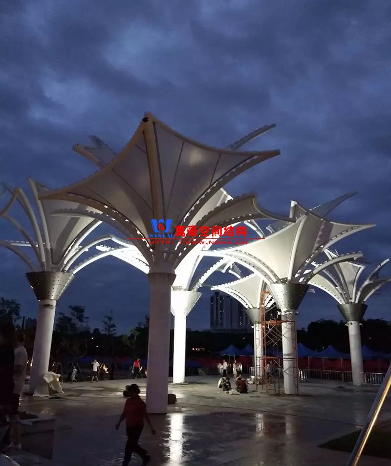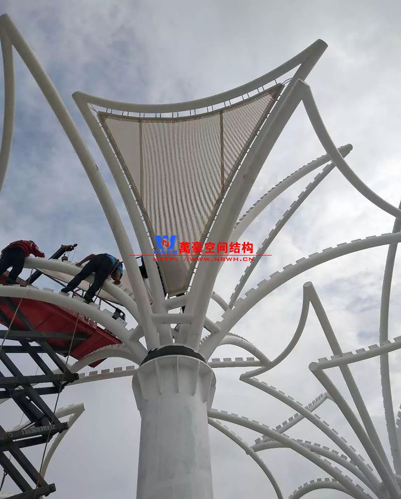 其中主席臺龍舟拉膜項目高度為7.25米,膜結(jié)構(gòu)屋面材質(zhì)為PTFE膜材。廣場鋼拉膜項目由六個龍船花造形景觀組成,每個龍船花景觀造形立柱的高度不得低于3.80米,花瓣造形最低高度 7.54米,花瓣造形最高高度9.608米,膜結(jié)構(gòu)屋面材質(zhì)為 PTFE網(wǎng)格基布雙面貼透明ETFE建筑膜。