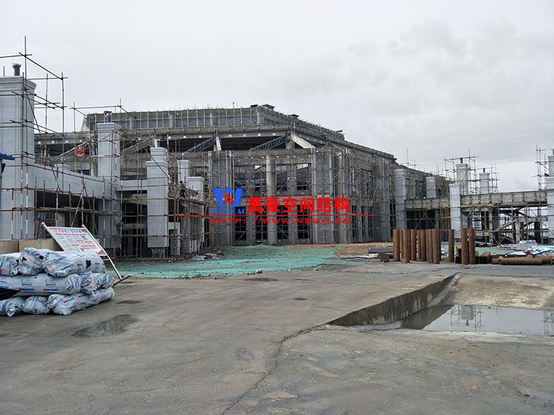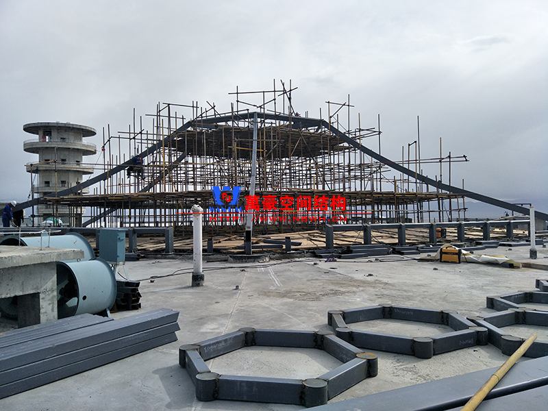 目前,主樓六邊形、二樓斜屋面每面四根大梁已全部安裝完畢,現(xiàn)在一個面的其他鋼構正在安裝中,穹頂大梁框架完成。