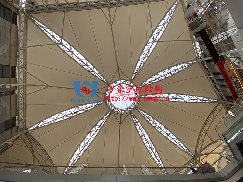 本屋面通廊加蓋項(xiàng)目由天幕雙曲面穹頂及四周通廊共同組合而成,其中穹頂部分主體結(jié)構(gòu)由8片“魚腹式”空間曲面桁架與 “皇冠式”圓頂共同組合而成,穹頂選用高性能新型建筑材料純透明ETFE膜材。四周通廊采用空間曲面桁架,結(jié)合綜合體的采光要求,我們選用白色PVDF高自潔膜材與純透明ETFE膜材的有效結(jié)合,在夜幕燈光照耀下,更是光彩奪目。