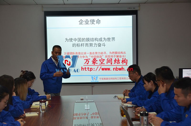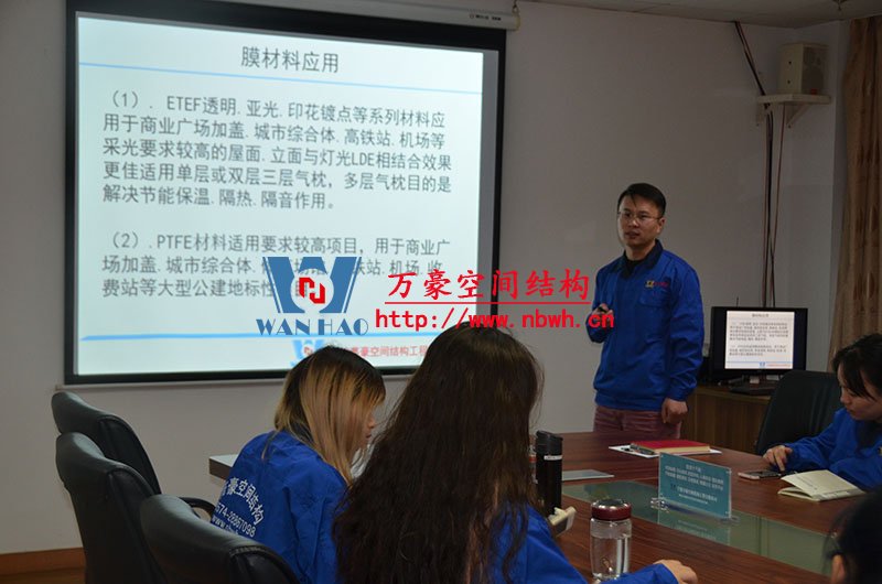 然后,我們的銷售主管教員工們學(xué)習(xí)了膜材料分類、膜結(jié)構(gòu)優(yōu)勢及應(yīng)用領(lǐng)域、膜結(jié)構(gòu)產(chǎn)品結(jié)構(gòu)形式等。