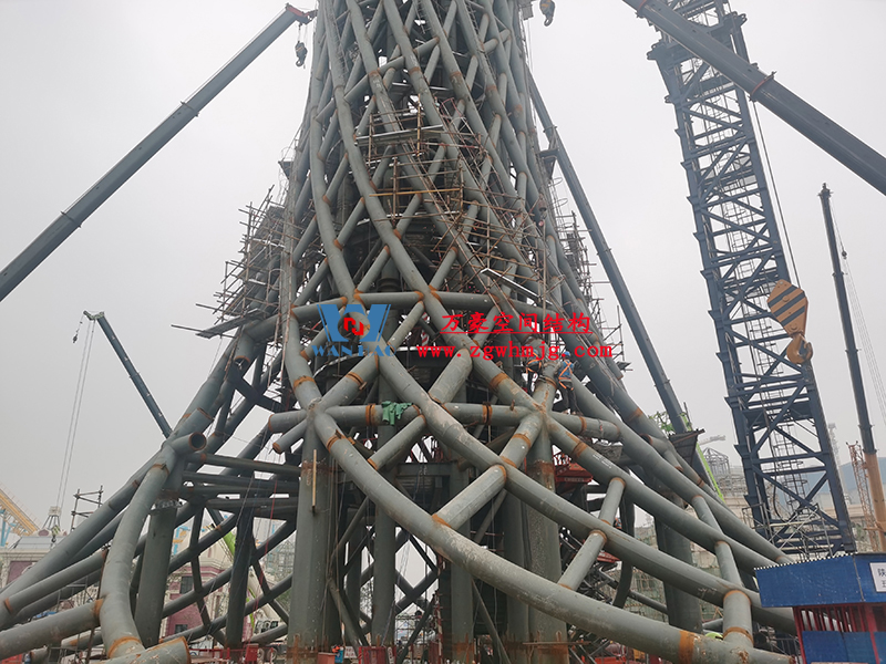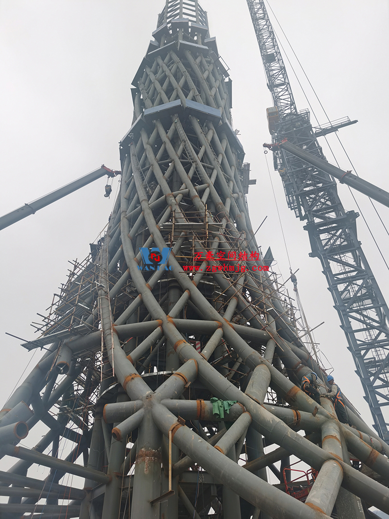 塔身為筒中筒鋼結(jié)構(gòu),內(nèi)筒為等間距布置的10根豎柱和水平梁組成,外筒為雙向螺旋交織的菱形網(wǎng)格曲線空間鋼結(jié)構(gòu),形似廣州小蠻腰,呈現(xiàn)“纖纖細(xì)腰,不盈一握”的驚人審美效果,也與中國(guó)傳統(tǒng)審美觀相契合。