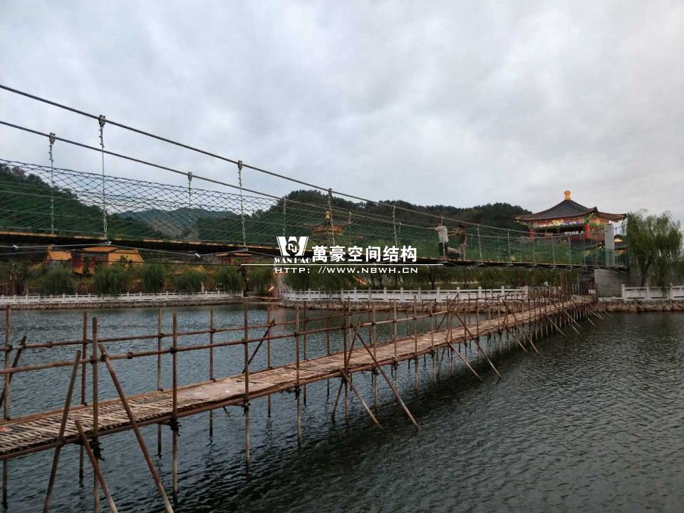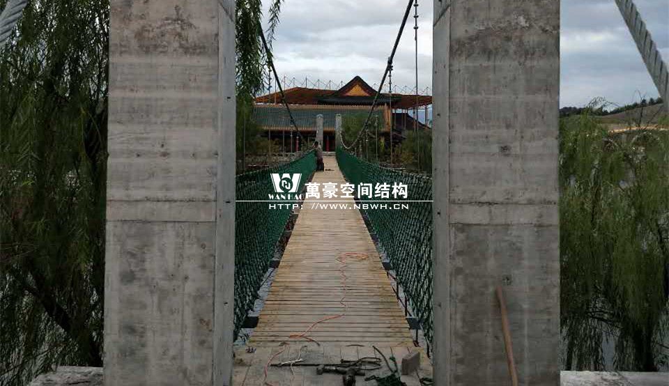該橋采用8根柔性鋼絲繩,4支立柱作為受力構(gòu)件,橋面采用組合型鋼作為支撐面,上鋪防腐木枋板。根據(jù)橋面與水位的相對(duì)高程,吊橋主跨為65m。該橋橋面凈寬度為1.5m,吊橋橋面總寬度2.0m。上鋪4公分厚的防腐木枋板。最多可承受130人行走,橋下能自由通行龍船。符合景區(qū)游客娛樂(lè)性游玩與功能性通行的完美結(jié)合在一起。