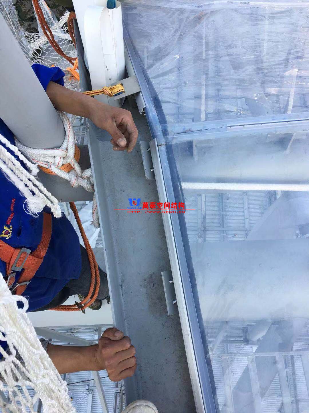 大家可以看到,已經(jīng)有幾處安裝上整塊的大膜了。接下來工作的重點,就是把剩下的區(qū)域全部安裝上膜材。雖然過程比較艱辛,但是看著這項工程一步步的走向終點,大家的斗志還是激昂的。